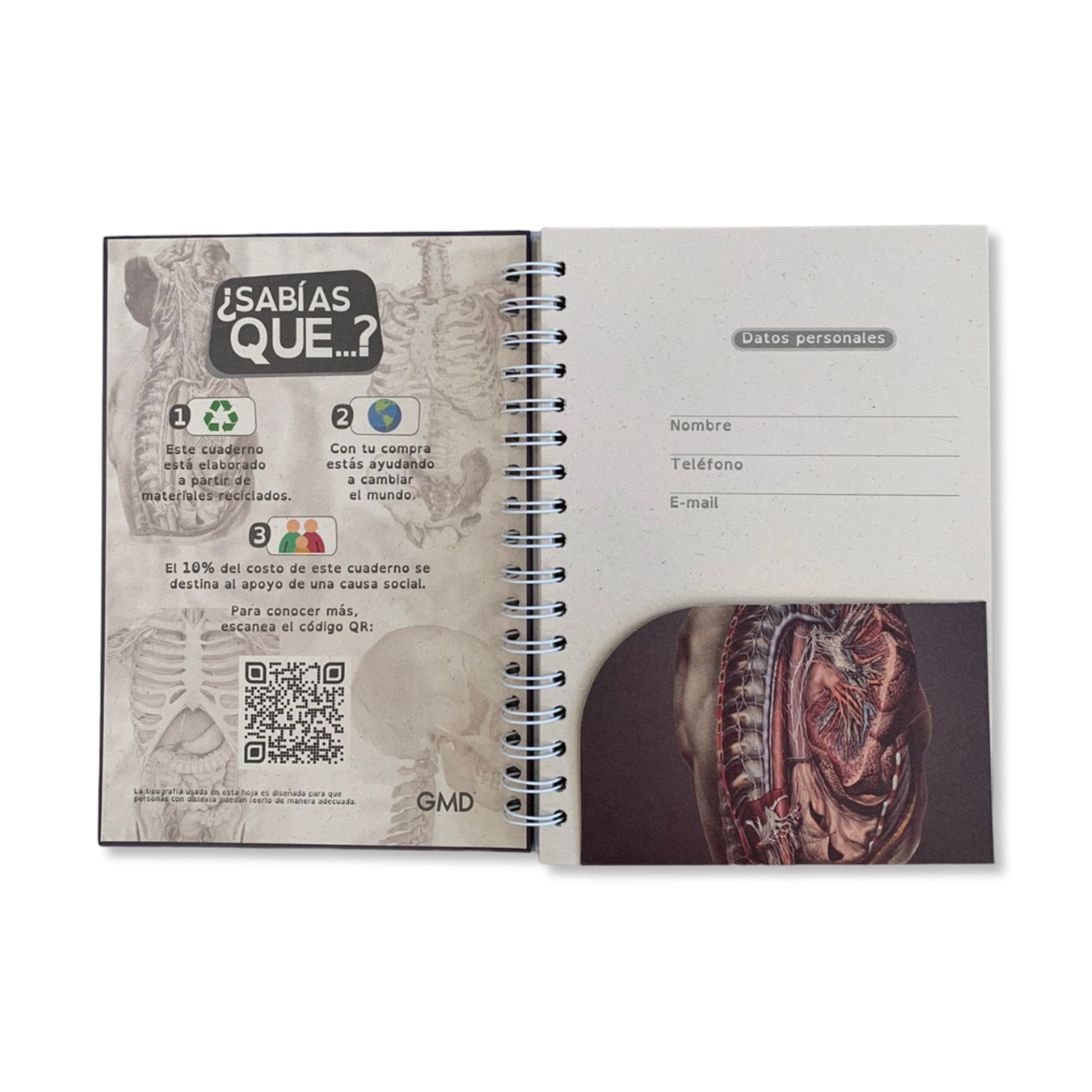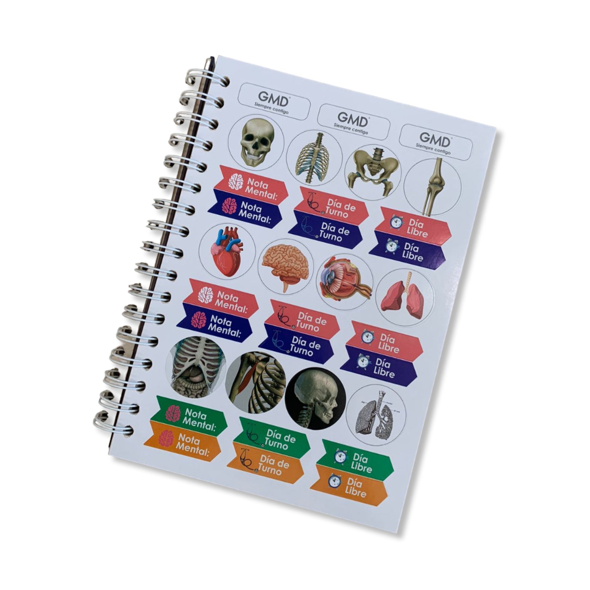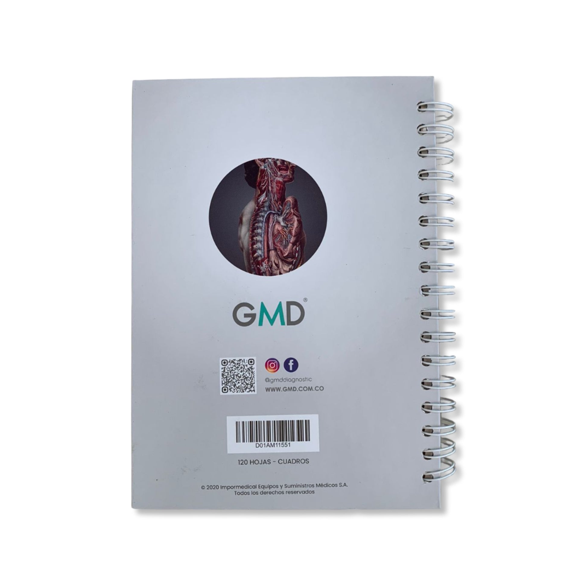 Cuaderno argollado con pasta dura de 120 hojas cuadriculadas, para la toma de notas. Disponible en motivos alusivos a la medicina y la salud.