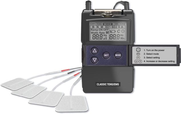El estimulador eléctrico Classic 7000 combina la función TENS (estimulación nerviosa eléctrica transcutánea) y EMS (estimulación muscular eléctrica)